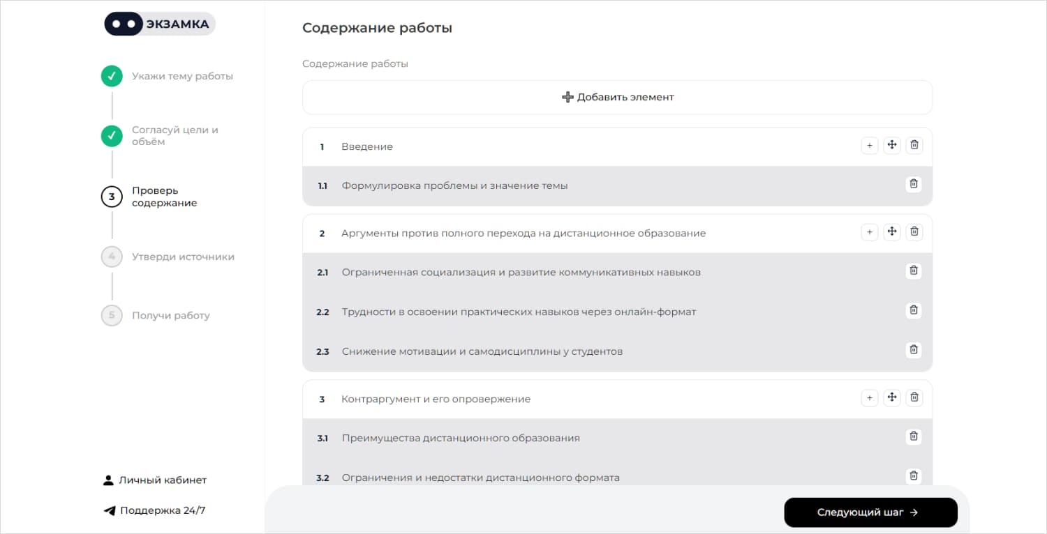 - Возможность редактирования плана перед генерацией дает контроль над структурой.