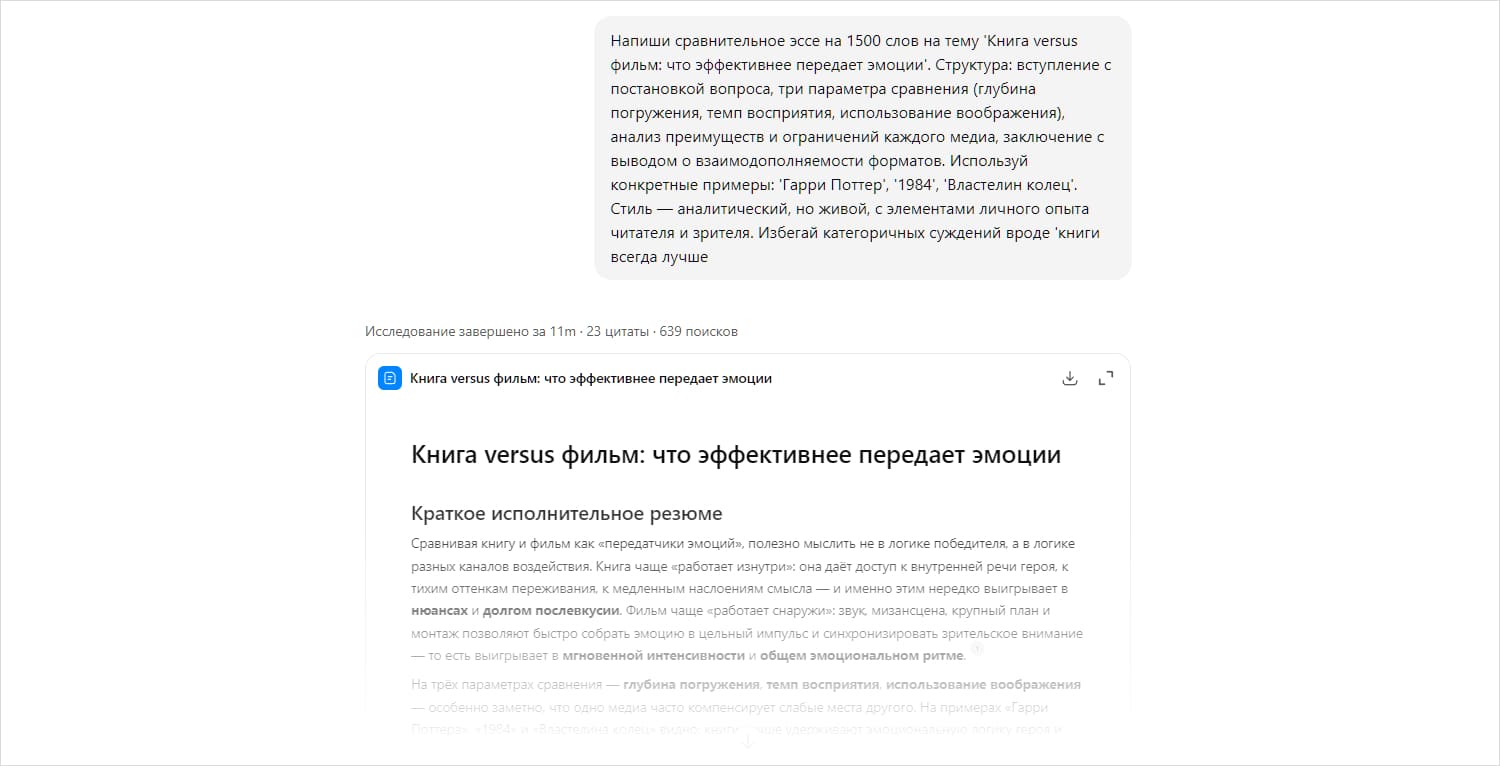 Помните: для эссе особенно важна итерация. Редко получается идеальный текст с первого раза. Я обычно генерирую несколько вариантов с разными промптами, выбираю лучшие фрагменты из каждого и комбинирую их, добавляя собственные мысли и примеры. Именно такой подход позволяет создать эссе, которое звучит авторски и убедительно.