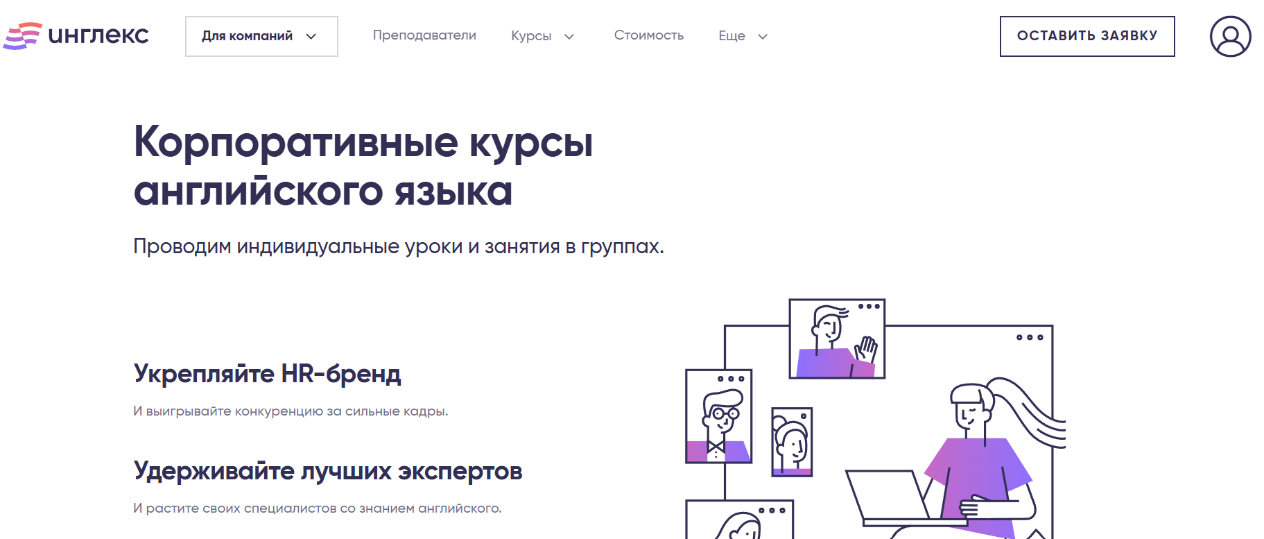 - Корпоративные курсы английского языка от Инглекс — методика адаптирована под нужды бизнеса, предназначена для улучшения международной коммуникации, продуктивности работы. Школа гарантирует простоту, скорость организации обучения.