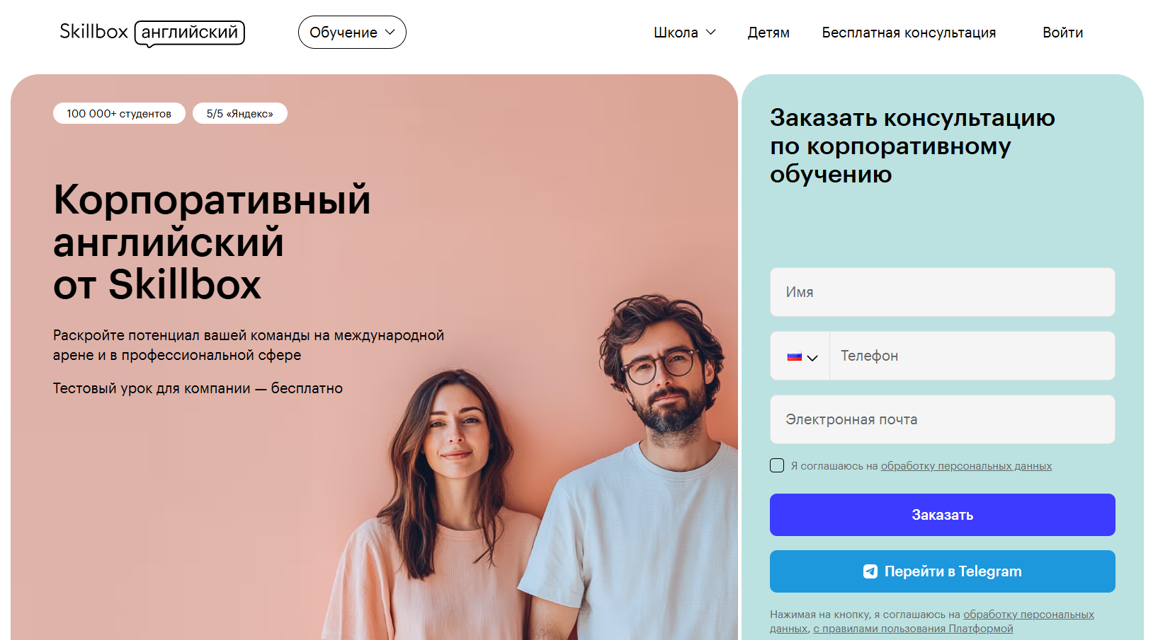 - Корпоративный английский от Skillbox — методика предусматривает использование ИИ для адаптации разговорной практики под конкретные нужды бизнеса и рабочие задачи сотрудника.