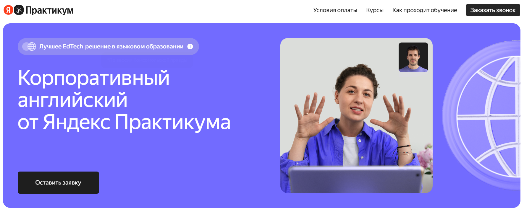 - Корпоративный английский от Яндекс Практикум — ведущее EdTech-решение в сфере обучения языкам, демонстрирует гибкость в форматах обучения. Расширяет пакет бенефисов разнообразие форматов: от специализированного IT-английского и общих курсов до безлимитной разговорной практики, программ для детей сотрудников.
