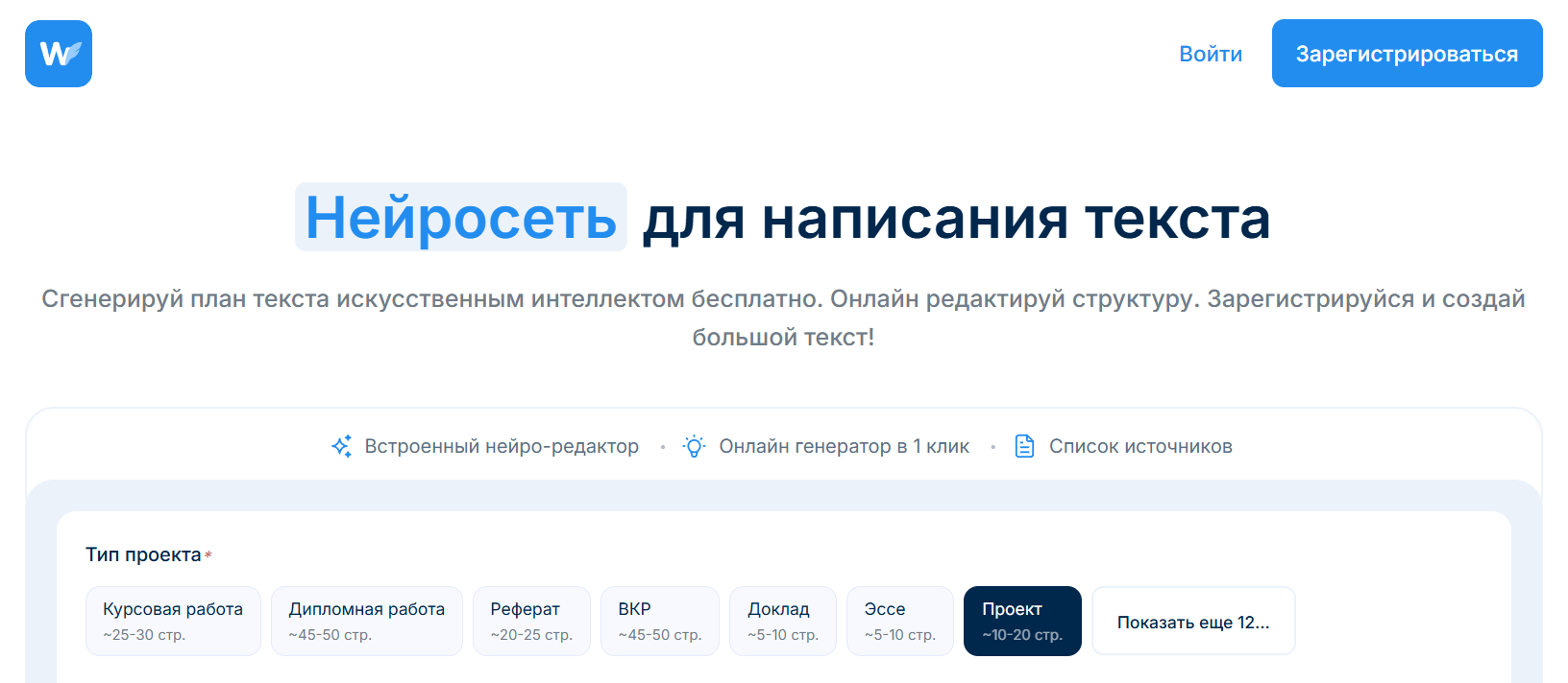 Онлайн-бот на базе искусственного интеллекта, предназначенный для генерации сочинений и других видов работ по заданной теме, включая автоматическое создание плана и структурирование содержания. Сервис предлагает бесплатную генерацию плана без регистрации, а после регистрации открывает доступ к полноценному нейро-редактору для создания, редактирования и сохранения больших текстов, которые можно скачать в формате Word. WordyBot включает функцию пошаговой обработки: пользователь указывает ключевые слова и тему, сервис мгновенно формирует структуру и дает возможность корректировки каждого раздела перед запуском итоговой генерации.