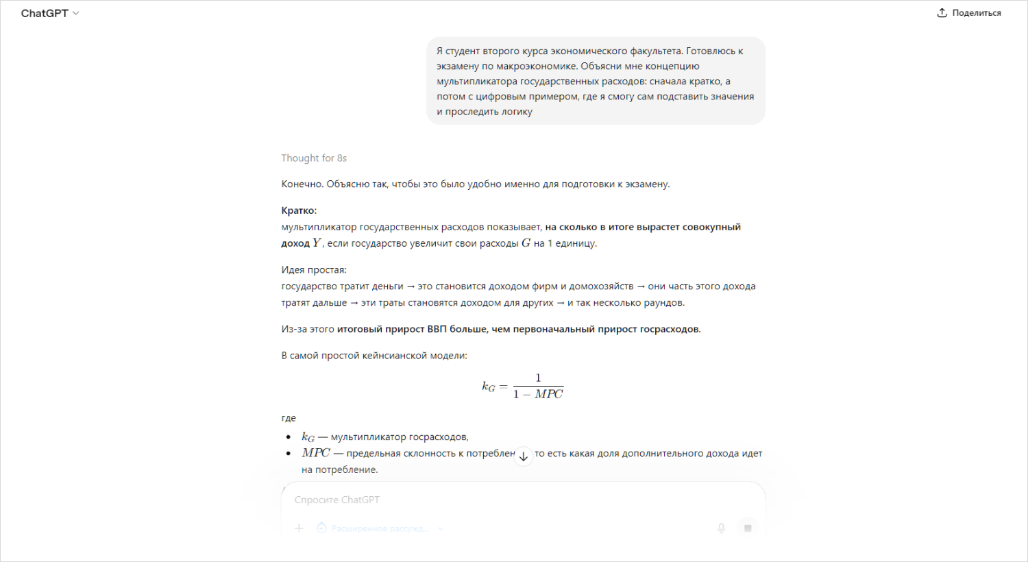 «Я студент второго курса экономического факультета. Готовлюсь к экзамену по макроэкономике. Объясни мне концепцию мультипликатора государственных расходов: сначала кратко, а потом с цифровым примером, где я смогу сам подставить значения и проследить логику».