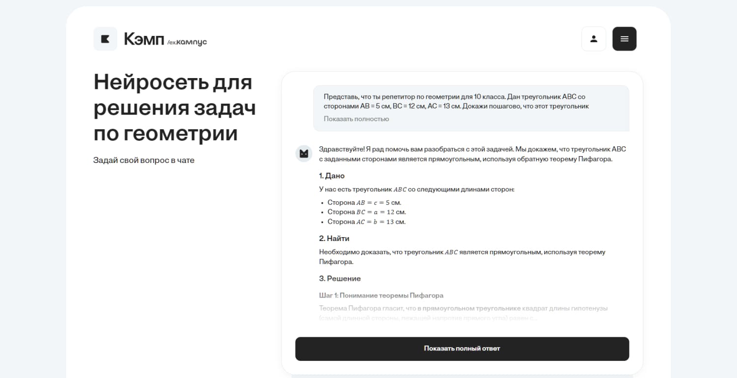 - Кэмп — нейросетевой помощник для студентов, анализирует условия задач и выстраивает логическую цепочку решения с подробными комментариями к каждому шагу.