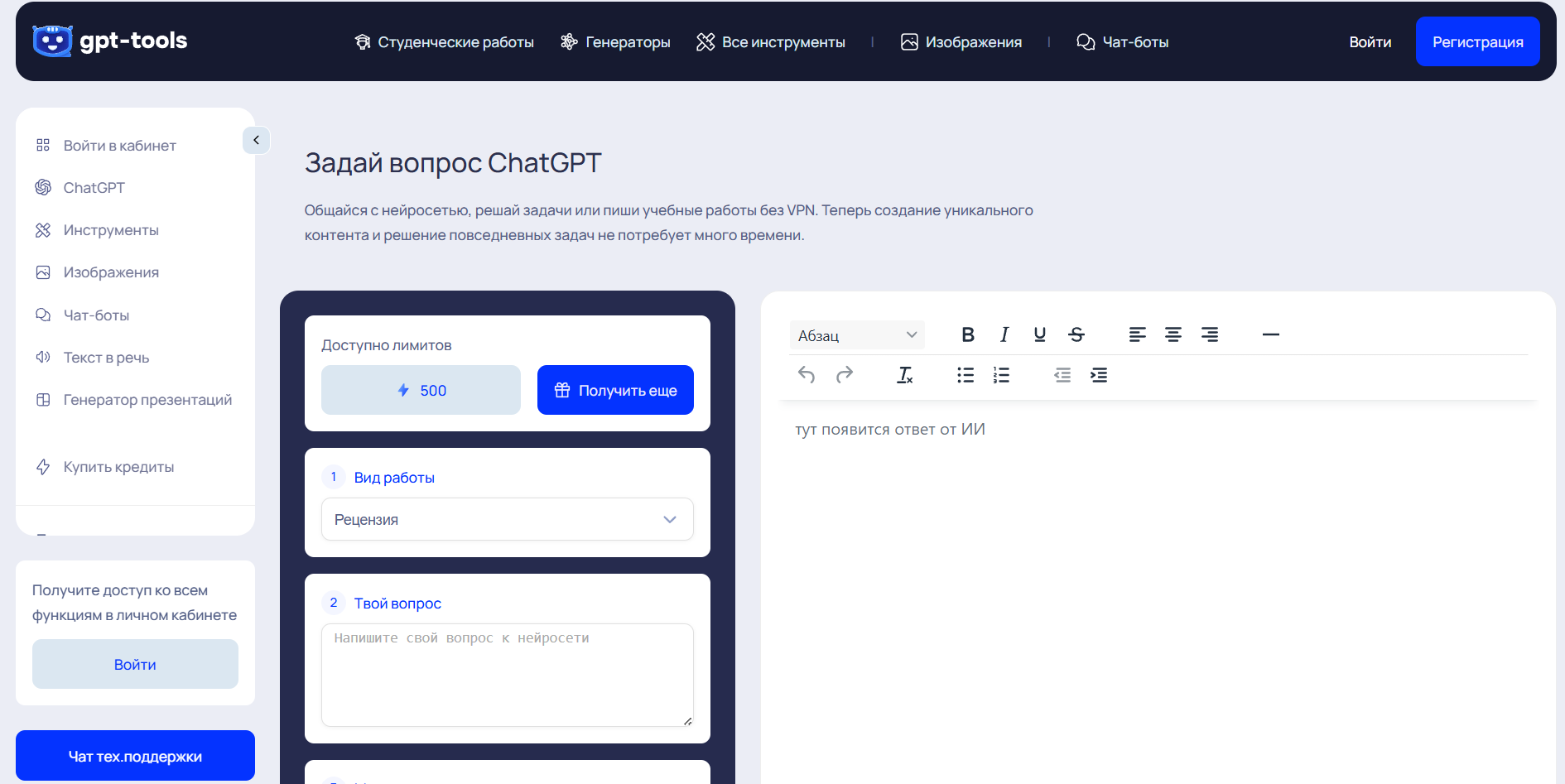 - Chat GPT Tools — доступная платформа с технологией GPT для графиков и создания, редактирования и анализа русскоязычного и иностранного контента.