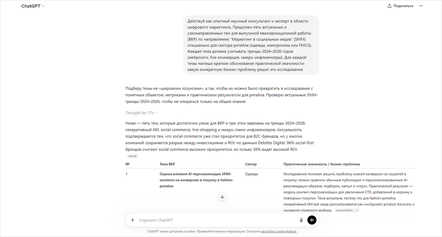 1. Выбор и обоснование темы. «Действуй как опытный научный консультант и эксперт в области цифрового маркетинга. Предложи пять актуальных и узконаправленных тем для выпускной квалификационной работы (ВКР) по направлению "Маркетинг в социальных медиа" (SMM) специально для сектора ритейла (одежда, электроника или FMCG). Каждая тема должна учитывать тренды 2024–2026 годов (нейросети, live-коммерция, микро-инфлюенсеры). Для каждой темы напиши краткое обоснование практической значимости: какую конкретную бизнес-проблему решит это исследование». Попробовать промпт.