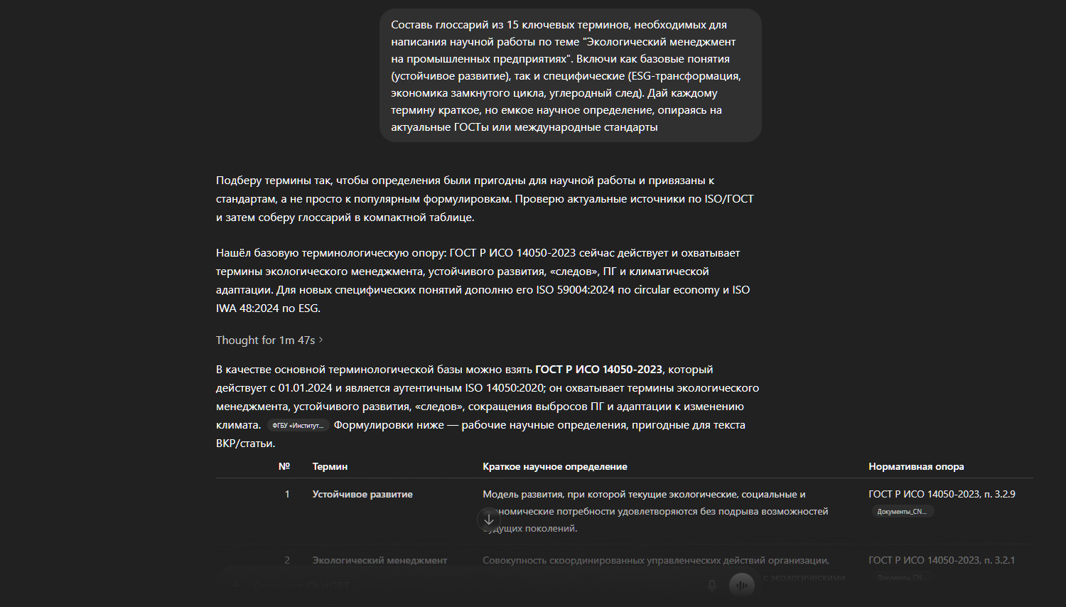 5. Генерация терминологического словаря. «Составь глоссарий из 15 ключевых терминов, необходимых для написания научной работы по теме "Экологический менеджмент на промышленных предприятиях". Включи как базовые понятия (устойчивое развитие), так и специфические (ESG-трансформация, экономика замкнутого цикла, углеродный след). Дай каждому термину краткое, но емкое научное определение, опираясь на актуальные ГОСТы или международные стандарты». Попробовать промпт.