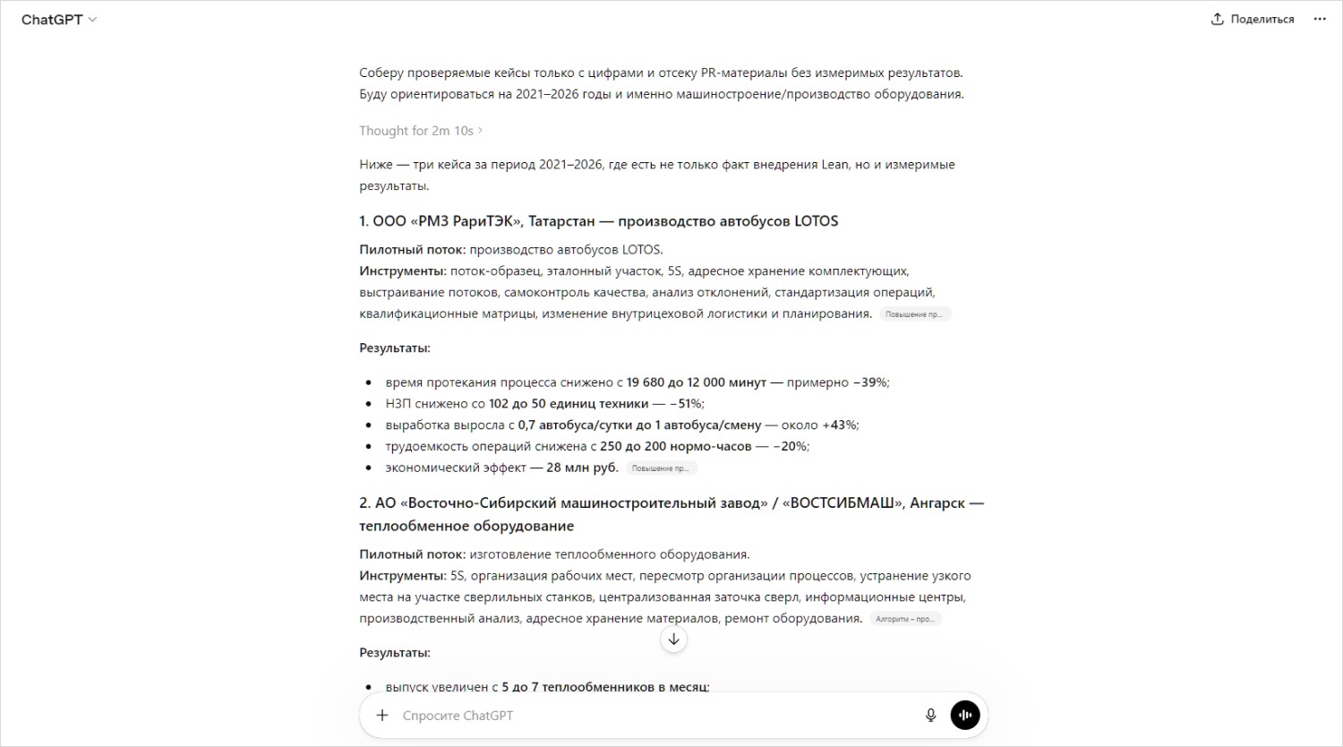 12. Поиск примеров (кейсов). «Найди и опиши три реальных кейса успешного внедрения инструментов бережливого производства (Lean Production) на российских предприятиях машиностроения за последние 5 лет. Для каждого кейса укажи: название предприятия (если возможно), внедренные инструменты (5S, Кайдзен и др.) и конкретные достигнутые результаты в цифрах (например, сокращение времени цикла на 15%, уменьшение брака). Избегай общих фраз, фокусируйся на фактах». Попробовать промпт.