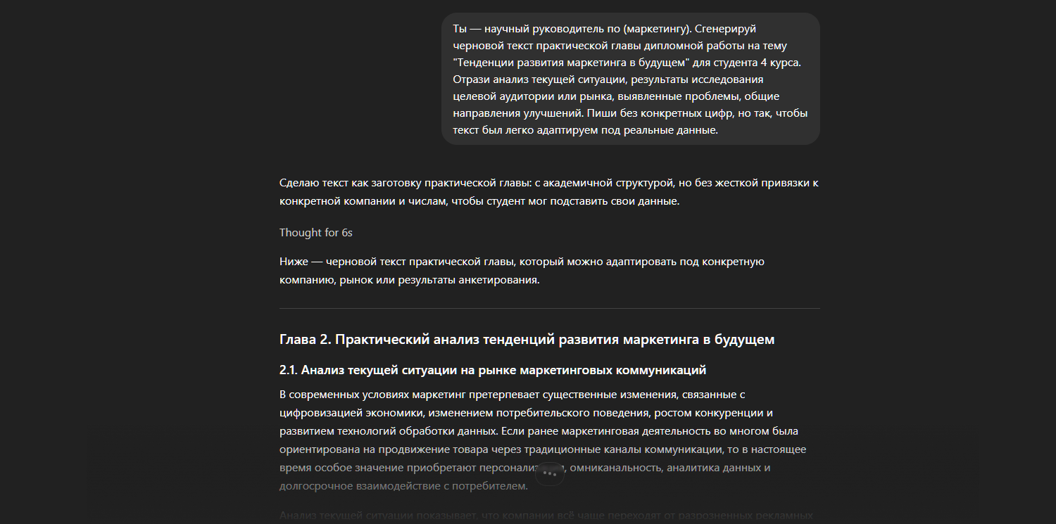 Также помогает разбивать сложную задачу на несколько простых этапов. Сначала можно попросить ИИ составить план, затем отдельно написать введение, потом раскрыть теоретическую часть, подобрать аргументы и сформулировать выводы. Если ответ получился неточным, стоит дать запрос заново: добавить недостающие детали, попросить переписать текст в академическом стиле, сократить объем или изменить структуру. Чем понятнее сформулирована задача, тем выше вероятность получить полезный и качественный результат.