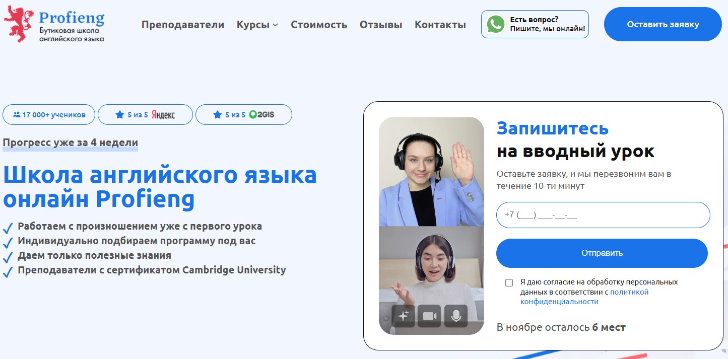 - Profieng — школа разговорного английского с индивидуальными программами, гибким расписанием и регулярным чекапом прогресса.