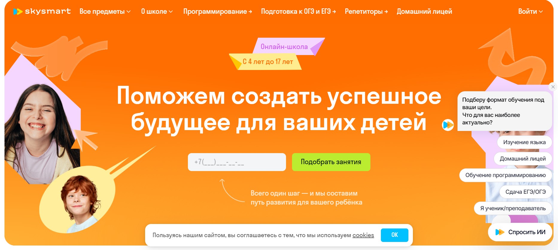 - SkySmart — онлайн-школа с интерактивной платформой и адаптивным обучением, ориентирована на детей, подростков и взрослых.