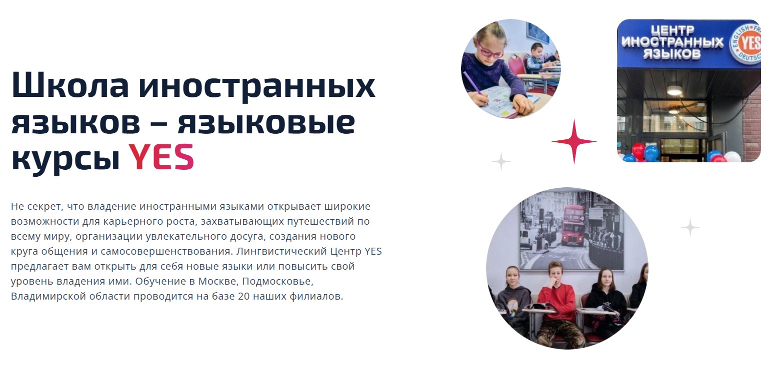 - Формат обучения: очные занятия в филиалах YES + онлайн-курсы; группы для детей, подростков и взрослых, корпоративное обучение, разговорные клубы, лагеря и спецкурсы