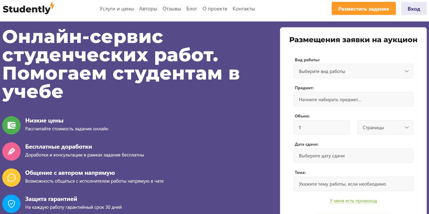 - Studently — отличается фокусом на академические работы и инновационными подходами к выполнению заданий для студентов разных уровней.
